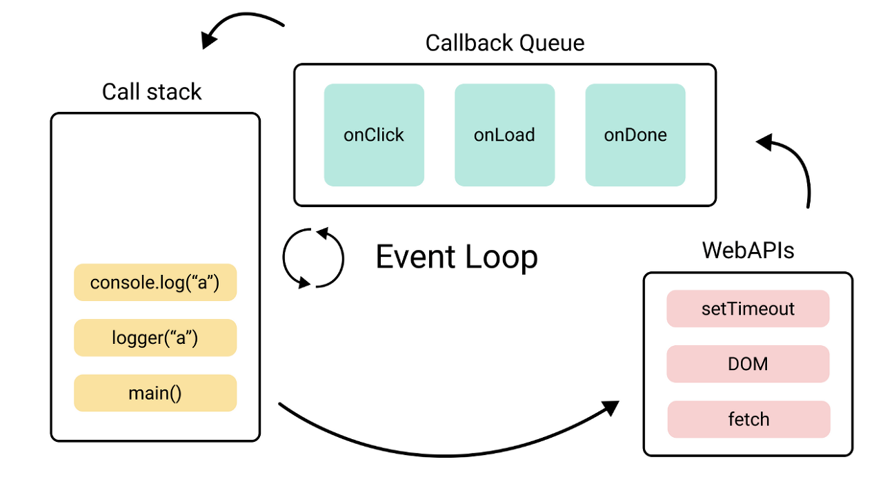 버튼 클릭 같은 이벤트나 DOM 이벤트, http 요청, setTimeout 같은 비동기 함수는 Web API를 호출하며 Web API는 콜백 함수를 Callback Queue에 push