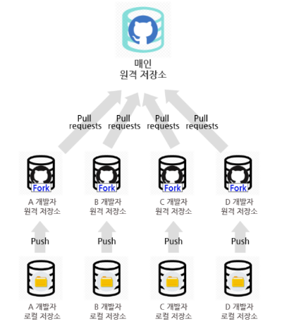 개발을 해서 Pull requests로 원 프로젝트 관리자에서 머지 요청을 보내면 원 프로젝트 관리자가 Pull requests된 코드를 보고 적절하다 싶으면 그때 그 기능을 붙히는 식으로 개발을 진행